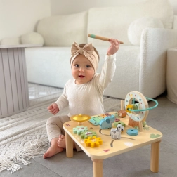 Scoprite un tavolino attività in legno di qualità che guida i bambini alla scoperta in modo naturale. Grazie alle diverse aree di gioco – dallo xilofono musicale agli ingranaggi fino al labirinto con palline – i bambini allenano coordinazione, precisione dei movimenti e comprensione di cause ed effetti. La struttura in legno robusta e i delicati colori pastello si adattano perfettamente alla cameretta.