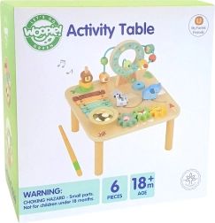 Tavolino multifunzionale in legno 5in1 del marchio WOOPIE GREEN unisce divertimento e apprendimento in un unico prodotto. Offre xilofono, labirinto con palline, ingranaggi, inserimento e classificazione delle forme e elementi di costruzione/infilatura. Supporta motricità fine, coordinazione occhio–mano, pensiero logico e percezione sensoriale. Realizzato in legno naturale con colori pastello e vernici sicure, ideale per bambini dai 18 mesi.
