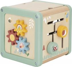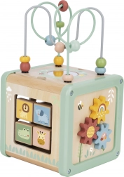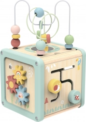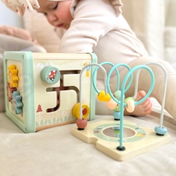 La parte superiore del cubo offre perline colorate da far scorrere lungo fili curvi, che sviluppano coordinazione e motricità fine. Lo specchietto stimola curiosità e percezione di sé.