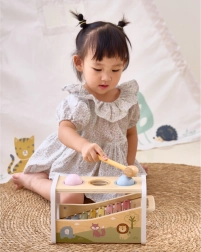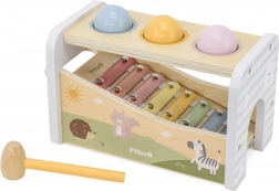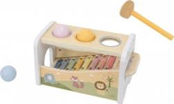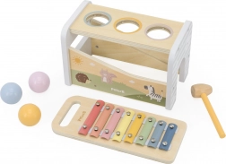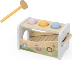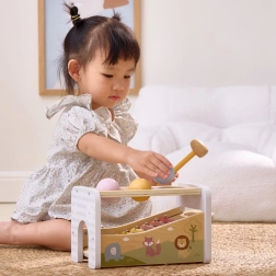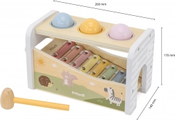 Questo versatile giocattolo in legno unisce panca per battitura e xilofono in un unico set intelligente. Il bambino può usare il martelletto per far cadere le palline colorate che rotolano sui tasti metallici producendo suoni piacevoli, oppure prendere la bacchetta e creare melodie proprie.