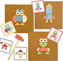 Set completo con forme in legno, chiodini, martelletto e base in sughero. I bambini possono comporre seguendo i modelli o lasciarsi guidare dalla fantasia.