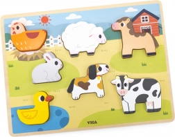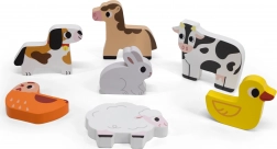 Il set include 7 dolci animaletti: gallinella, pecorella, cavallino, coniglietto, paperella, cagnolino e mucca. Grazie al maggiore spessore dei pezzi, sono facili da afferrare e possono essere usati anche fuori dalla base come figurine indipendenti per giochi di fantasia.