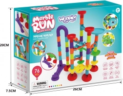 Il set creativo della pista a biglie WOOPIE è il gioco ideale per bambini curiosi. Grazie ai colori vivaci e alle diverse forme di tubi, imbuti e curve, i bambini possono assemblare con facilità percorsi originali e guardare le biglie sfrecciare una dopo l’altra.
