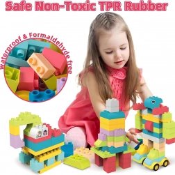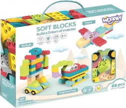 Il set di costruzioni WOOPIE contiene 86 pezzi, che si collegano facilmente e permettono ai bambini di creare diverse costruzioni 3D come auto, aerei o animali. I blocchi sono grandi e morbidi, il che garantisce la loro sicurezza durante il gioco, e possono essere bolliti a 120 gradi per una facile manutenzione.