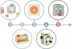 I giochi sono colorati, sicuri e facili da afferrare con le piccole mani. Grazie alle attività ben studiate, i bambini esercitano motricità fine e grossolana, coordinazione, percezione dei colori e rappresentazione spaziale. Il libricino con fotografie reali supporta lo sviluppo del linguaggio e la consapevolezza del proprio corpo.