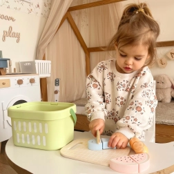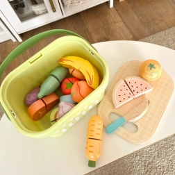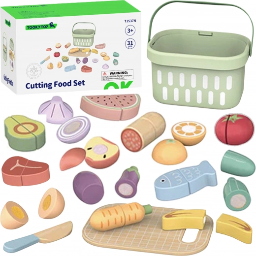 Il set in legno per tagliare gli alimenti di Tooky Toy è ideale per il gioco creativo in cucina. Il set include 31 elementi come frutta, verdura, pesce, uovo, tagliere e coltello. Questo equipaggiamento completo consente di preparare piatti gustosi.
