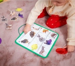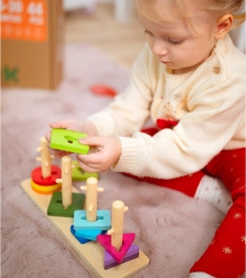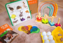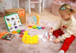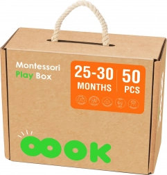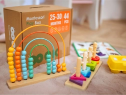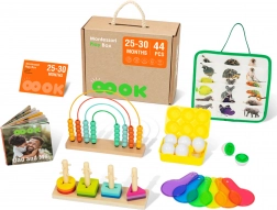 La scatola educativa include diverse attività, come ordinazione delle forme, puzzle animali e tavole ottiche colorate, che sviluppano l'immaginazione visiva e le abilità manuali. Altre attività includono, ad esempio, un contatore arcobaleno che insegna piccole operazioni matematiche, e una pista a sfere Montessori, che migliora la coordinazione occhio-mano. Sono anche disponibili libri che aiutano i bambini a comprendere i rapporti tra grande e piccolo, così come molti altri esercizi creativi.