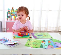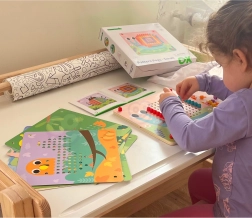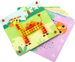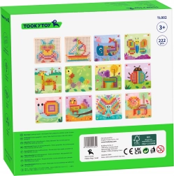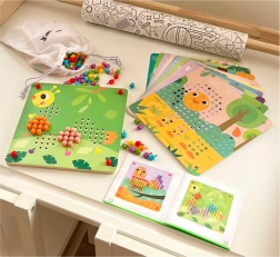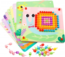 Il mosaico di legno con chiodini colorati e immagini allegre porta molta gioia ai bambini e ne stimola lo sviluppo creativo.