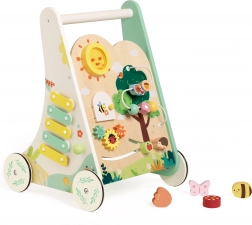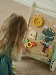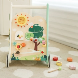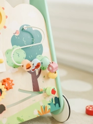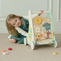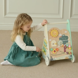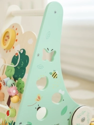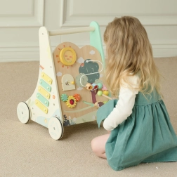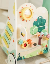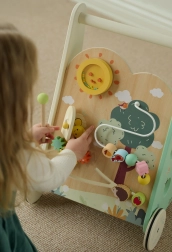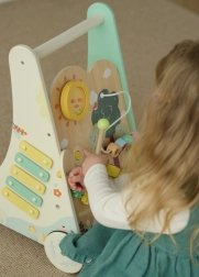 Il deambulatore cresce con il bambino: dal supporto nella camminata al gioco indipendente con attività che sviluppano motricità fine, capacità di coordinazione, udito e pensiero logico. Le superfici sono trattate con colori sicuri e atossici in delicate tonalità accattivanti.