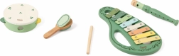 Il set include xilofono, tamburello, flauto dolce/recorder, castagnetta e bacchetta: una combinazione ideale per scoprire ritmo e tonalità già dai 18 mesi.