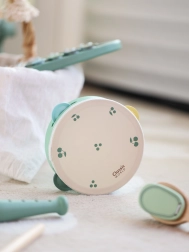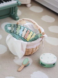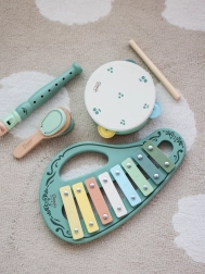 Questo set dallo stile vintage contiene tutto ciò di cui i più piccoli hanno bisogno per esplorare il mondo dei suoni: cimbali (xilofono), tamburello, flauto dolce/recorder, castagnetta e bacchetta. Grazie alla combinazione di legno e metallo, gli strumenti hanno un suono gradevole e resistono al gioco quotidiano.