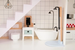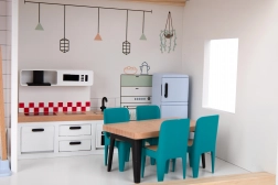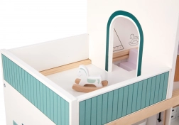 Scopri il fascino dell'architettura moderna nel mondo dei bambini. La casetta per bambole in legno TOOKY TOY ha 3 livelli ricchi di dettagli – cucina con sala da pranzo e bagno al piano terra, ampio soggiorno al primo piano e accogliente camera da letto con balcone in mansarda. Inclusi mobili e decorazioni che donano a ogni stanza un'atmosfera realistica.