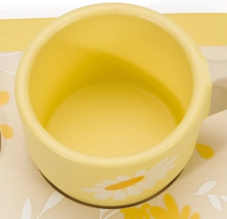 Il set include piatto, posate, tazza, sale, pepe, uovo, fette di pane tostato, una fetta di pancetta e altro.