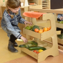La bancarella del mercato in legno Masterkidz con un tetto in tessuto offre una struttura a due livelli per la massima flessibilità. Al primo livello troverai tre scomparti, ideali per diversi tipi di prodotti.
