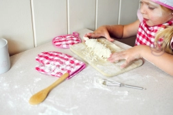 I guanti a quadri rosa-bianco e il supporto proteggono le piccole mani dalle superfici calde, rendendo la cottura sicura.