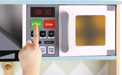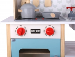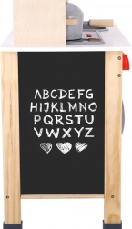 Questa bellissima cucina giocattolo in legno offre una vasta gamma di funzioni, come fornello, forno, microonde e bacheca su cui i bambini possono disegnare. La cucina è realizzata con materiali di alta qualità ed è destinata a bambini dai 3 anni in su.