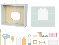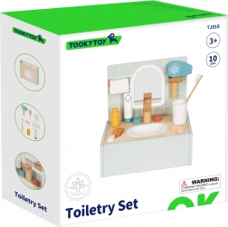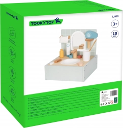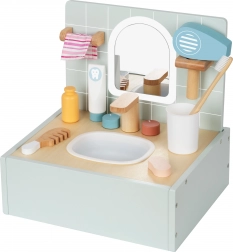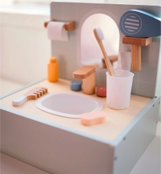 Trasforma i rituali igienici quotidiani in un divertimento creativo con il bagno in legno di Tooky Toy. Questo adorabile mini set include tutto il necessario per giocare con scene da bagno, compreso uno specchio, un lavandino fittizio con rubinetto e accessori realistici.