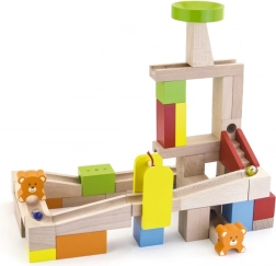Questa pista delle biglie in legno del marchio VIGA offre ai bambini ore di divertimento e apprendimento. Con vari blocchi, rampe, pilastri e un imbuto potrai costruire senza fatica innumerevoli tracciati su cui le biglie rotolano fluide. Il set include anche elementi decorativi e giocosi, come scalini e orsetti, che danno carattere alle costruzioni e stimolano la narrazione di storie.