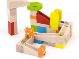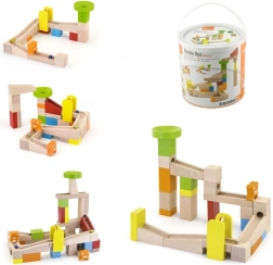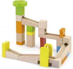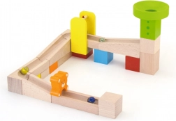 Il set include rampe, pilastri, blocchi ed elementi speciali con cui potrai comporre piste per biglie semplici o elaborate.