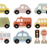 - Il set include 8 veicoli diversi: taxi, auto privata, food truck, camion della spazzatura, pompieri, scuolabus, ambulanza, auto della polizia
