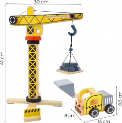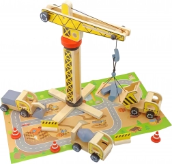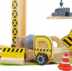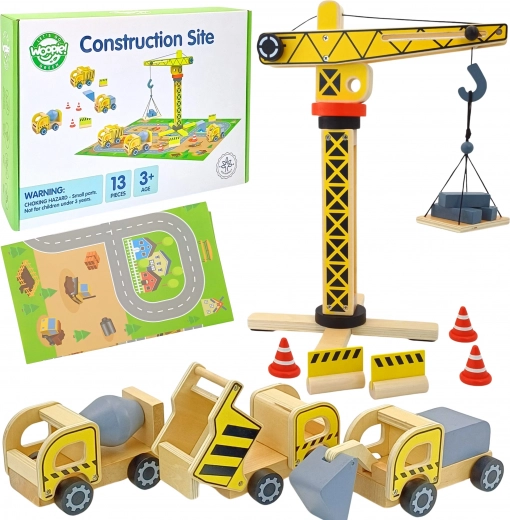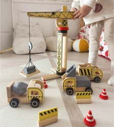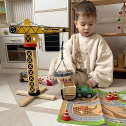 Il set di costruzioni ampliato del marchio WOOPIE GREEN è destinato ai piccoli costruttori. Questo set include una grande gru in legno, tre veicoli da costruzione e altri accessori per giochi di costruzione realistici.