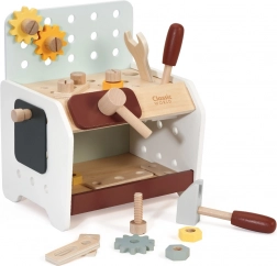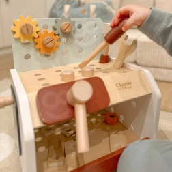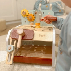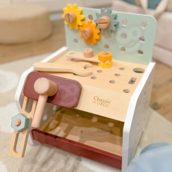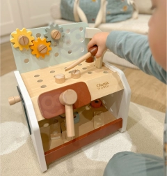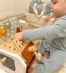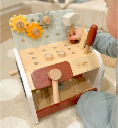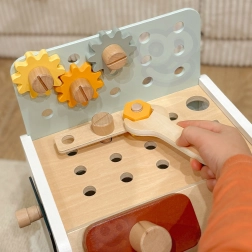 Pratico e facilmente trasportabile, il banco da lavoro in legno per bambini offre tutto ciò di cui ha bisogno un piccolo fai-da-te: martello, cacciavite, chiave, viti, dadi, ingranaggi e listelli con fori. I bambini possono forare, avvitare e martellare, sviluppare la logica e imparare i principi di causa ed effetto.