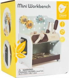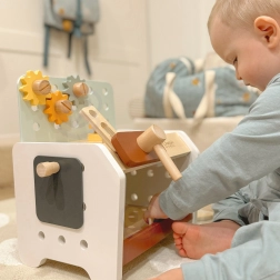 La lavorazione di qualità in legno solido con spigoli lisci garantisce un gioco sicuro. Sui lati ci sono fori per avvitare i pezzi, ampliando le possibilità di costruzione e di gioco creativo. Grazie alle sue dimensioni, il mini banco è perfetto sia per la cameretta che per i viaggi.