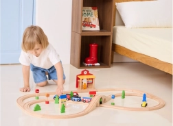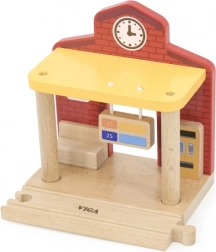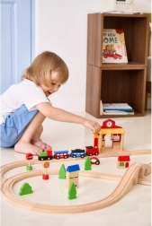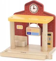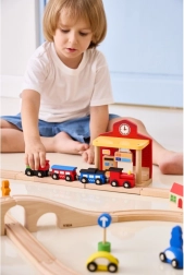 La stazione è ideale per scenette dei bambini – dalla vendita dei biglietti agli arrivi e alle partenze dei treni. Le dimensioni sono studiate per adattarsi facilmente alla maggior parte dei piani di gioco ed essere compatibili con i binari in legno più comuni. Il gioco stimola la motricità fine, la coordinazione occhio–mano e le abilità sociali.