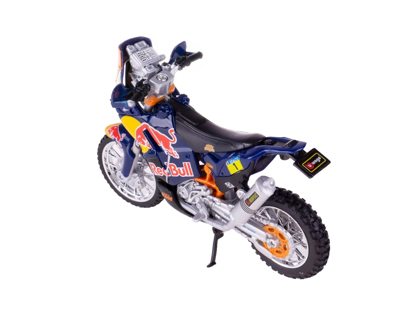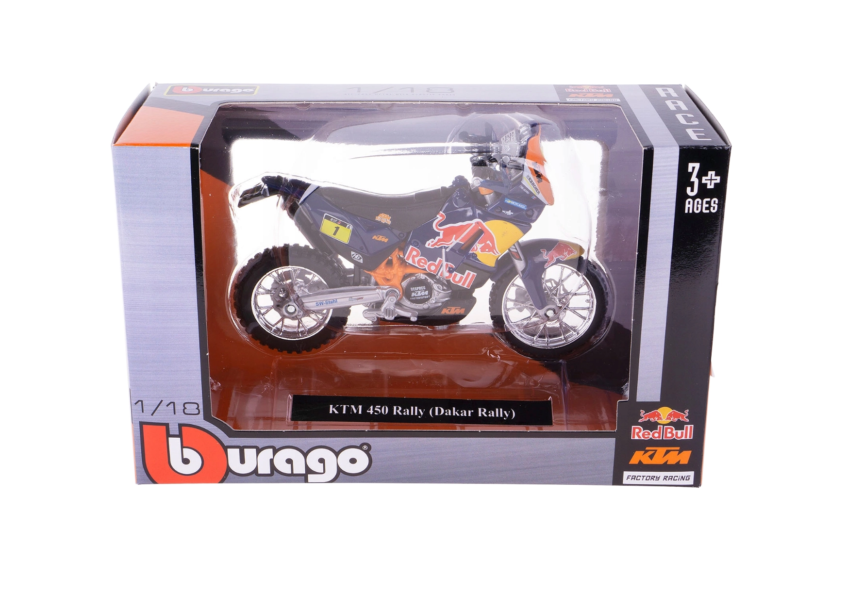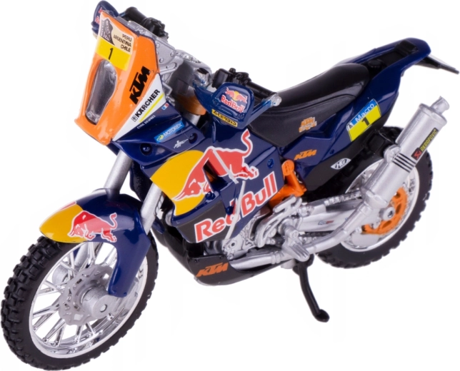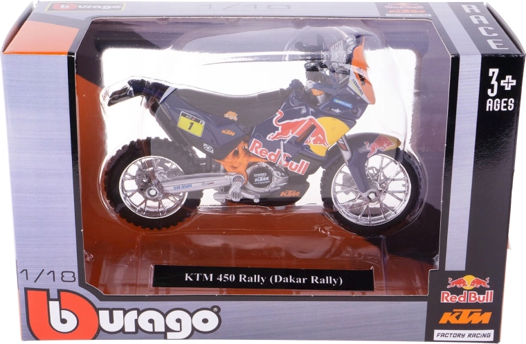 Modello della motocicletta Red Bull KTM 450 Rally in scala 1:18 del marchio Bburago, realizzato con cura. Struttura in metallo con dettagli in plastica che offre particolari realistici, ideale per collezionisti e piccoli piloti a partire da 3 anni.