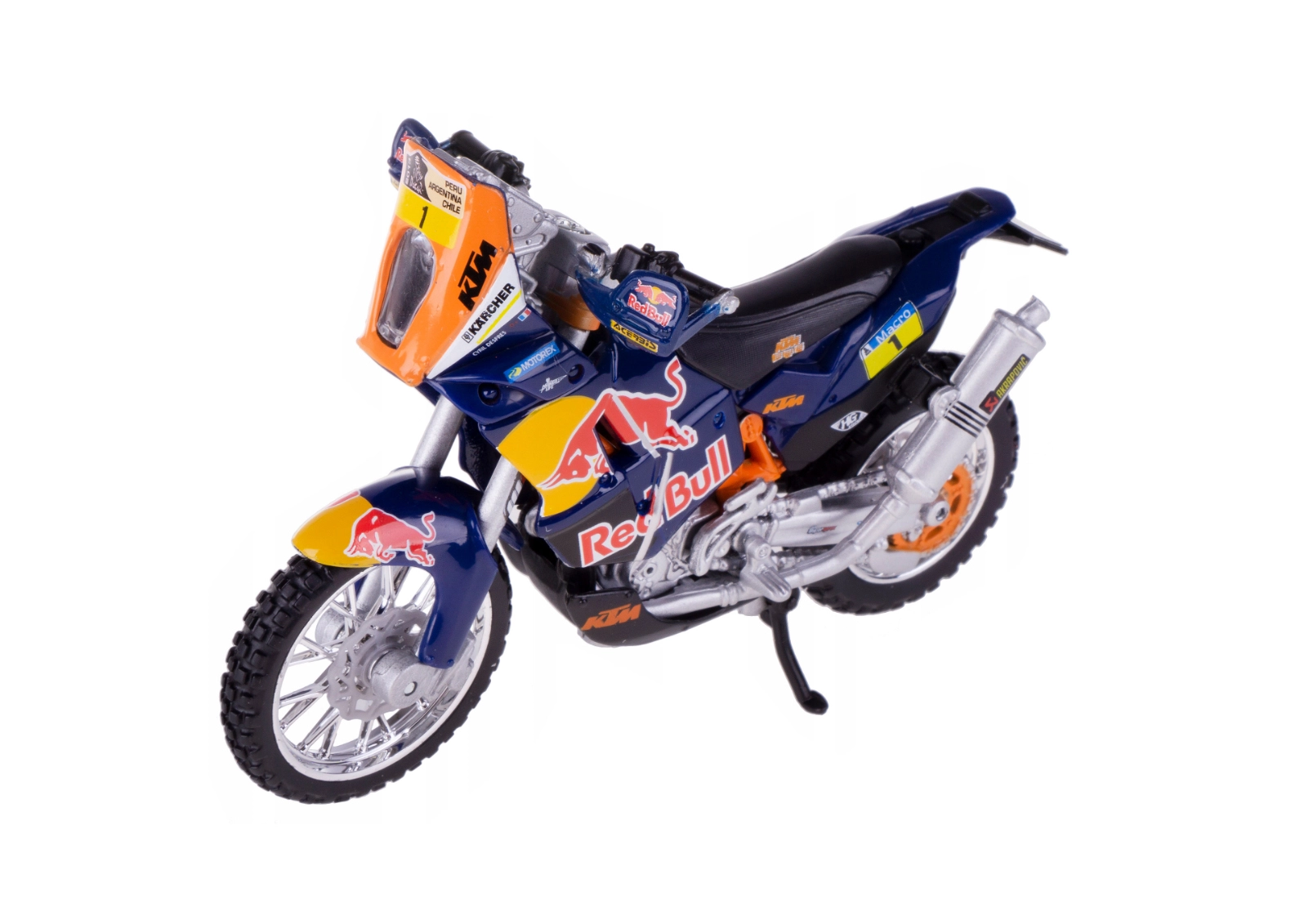 Scoprite la replica precisa dello speciale da gara del Red Bull KTM Factory Racing per la leggendaria Dakar Rally. Il modello Bburago in scala 1:18 colpisce per il corpo in metallo di qualitE0, i dettagli in plastica finemente realizzati e il design cromatico autentico del team.