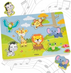 Scopri il mondo della giungla con il puzzle sonoro in legno Viga. Quando il bambino inserisce correttamente il tassello, si sente il suono realistico dell'animale, favorendo l'apprendimento attraverso il gioco. Il giocattolo sviluppa la motricità fine, la coordinazione mano-occhio e la percezione dei suoni. Grazie alle illustrazioni di supporto, i bambini imparano più facilmente ad abbinare correttamente le forme.