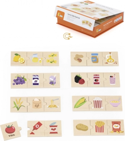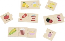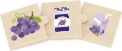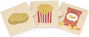 Questo set in legno di alta qualità presenta semplici puzzle che collegano la materia prima al suo prodotto lavorato. I bambini imparano in modo divertente da dove provengono le loro golosità preferite – ad esempio patata e patatine fritte, limone e limonata, mais e popcorn oppure uva e marmellata/succo d’uva.