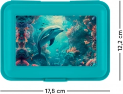 Mantieni il tuo cibo fresco e ben conservato con questa bellissima scatola per il pranzo a tema delfini. La sua chiusura con un solo fermo assicura che il contenuto rimanga conservato in sicurezza. Il divisorio interno permette un'organizzazione efficiente del cibo secondo le tue necessità.