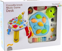Scoprite un tavolino interattivo divertente e stimolante per i più piccoli, che unisce apprendimento e gioco. Grazie al pianoforte con suoni di animali, agli effetti luminosi, al gioco con il martelletto e alla testa interattiva del coccodrillo, favorisce lo sviluppo della motricità, della percezione uditiva e della coordinazione mano–occhio.