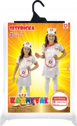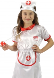 Un adorabile costume di carnevale per piccole infermiere che farà felice ogni amante dei giochi da dottore. La taglia M è adatta a bambine di 6–8 anni (117–128 cm). Il set include abito e cuffia; lo stetoscopio non è incluso nella confezione.