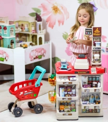 supermercato con scaffali ed etichette prezzo, cassa con cassetto, terminale di pagamento, scanner con luce e suono, bilancia, carrello della spesa, denaro di carta, carta di pagamento, alimenti in plastica (frutta, verdura, bevande, latticini, ecc.)