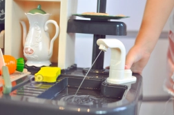 Premendo la pompetta l’acqua inizia a scorrere dal rubinetto. Grazie al circuito chiuso, il gioco è pulito, divertente e senza disordine.
