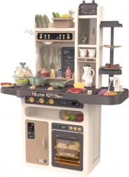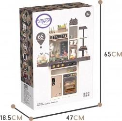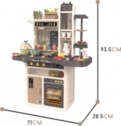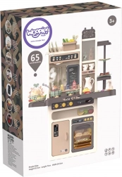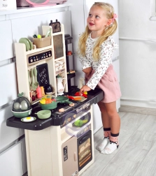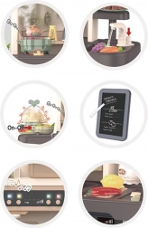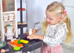 Sono inclusi anche un cuociuova con luce LED e suono, il forno e il frigorifero apribili, una lavagna per gessetti per il menù del giorno, un portapiatti e vari vani portaoggetti. Il ricco set di 65 accessori comprende frutta e verdura con velcro, stoviglie, posate e un set da tè: tutto ciò di cui i bambini hanno bisogno per un gioco creativo.