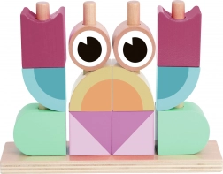 Il set comprende 18 pezzi: una base in legno, 12 blocchetti sagomati e 5 carte a doppia faccia con modelli. I bambini possono costruire seguendo i modelli o creare combinazioni personali – dalle semplici torri a divertenti composizioni “animali”. Colori sicuri e atossici e legno di qualità assicurano lunga durata e una presa confortevole per le manine.