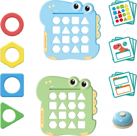 Il set include due tavole dinosauro, un set di forme geometriche colorate, 48 carte modello e una campanella per una sfida avvincente in due. Materiali robusti, bordi lisci e colori intensi garantiscono un’interazione sicura e piacevole.