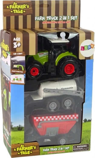 Il set include un trattore realistico dotato di effetti luminosi e sonori e due macchine agricole che simulano il lavoro quotidiano nei campi. Il trattore è dotato di tre pulsanti funzionali sul tetto per attivare i suoni del motore, del clacson e della retromarcia, offrendo un realismo ancora maggiore grazie ai fari anteriori luminosi.