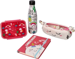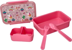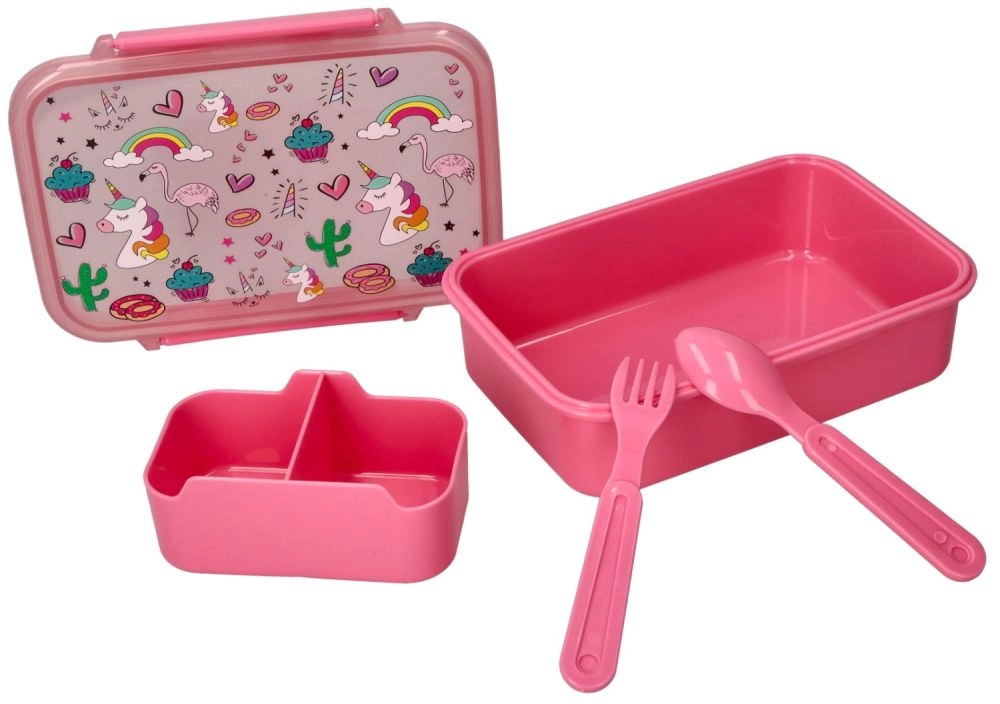 Motivi colorati di unicorni, arcobaleni e cuoricini stimolano la gioia dei bambini durante la merenda e rendono il box un accessorio preferito per la scuola.