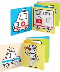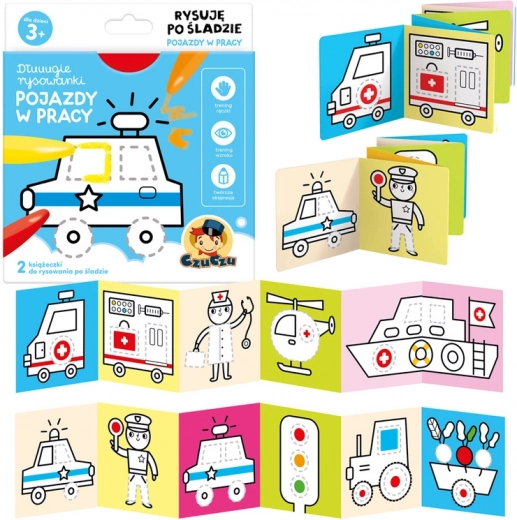 Entra nel mondo della creatività con il nostro set creativo, che include due lunghi libri fisarmonica con veicoli colorati. Queste illustrazioni complete sono adattate per piccoli artisti con entusiasmo per il disegno e la pittura.