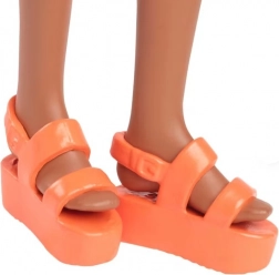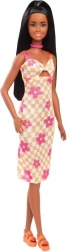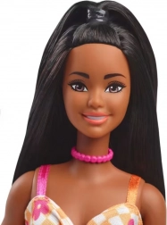 Splendida bambola alta Barbie con lunghi capelli neri parzialmente raccolti, impreziosita da un choker rosa e sandali arancioni con zeppa. Il suo look è completato da un elegante abito con motivo floreale.