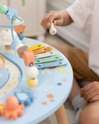 Il tavolino include uno xilofono, campanelli e altri elementi musicali che risvegliano l'interesse per la musica e il ritmo.