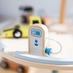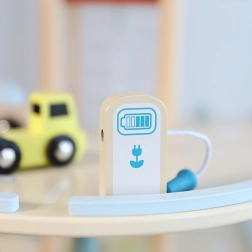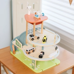 Questo edificio di parcheggio in legno a tre livelli permette, grazie all'ascensore manuale, di spostare i giocattoli tra i piani. Una speciale rampa a zigzag consente una rapida discesa delle auto. Inoltre, il dispositivo è dotato di una stazione di ricarica elettrica. Il set include tre macchinine e un elicottero, offrendo ore di divertimento e sviluppando l'immaginazione dei bambini.