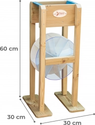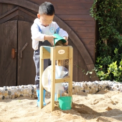 Versa sabbia o acqua nell’imbuto e guarda come la ruota blu inizia a girare. I bambini comprendono intuitivamente il principio del movimento e dell’energia e sviluppano il pensiero logico.