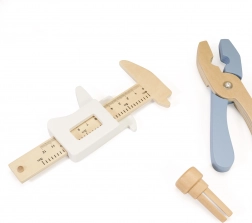 Inclusi martelletto, cacciavite, chiave piatta, seghetto, pinze e misuratori funzionali: ideali per allenare la motricità fine e la coordinazione.