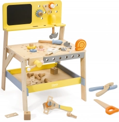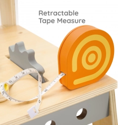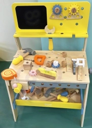 Il banco da lavoro in legno è un gioco ideale per i piccoli artigiani. I bambini possono avvitare, martellare, misurare e assemblare ingranaggi mentre sviluppano abilità manuali e pensiero logico. La lavagna a gesso integrata è perfetta per schizzi e idee per nuovi progetti.