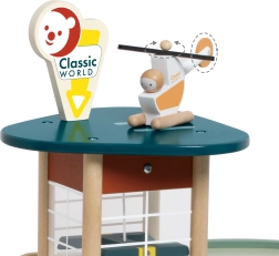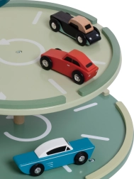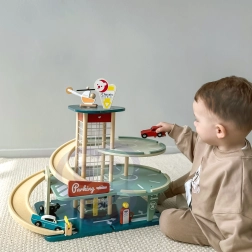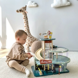 Il garage retrò ispirato agli anni ’50 è una scelta perfetta per i piccoli appassionati di auto e tecnologia. I bambini possono parcheggiare le auto su tre piani, farle passare attraverso l’autolavaggio, fare rifornimento al distributore e usare l’ascensore funzionante fino al tetto, dove li aspetta un elicottero. Grazie alle rampe in bioplastica lo spostamento tra i livelli è facile e divertente.